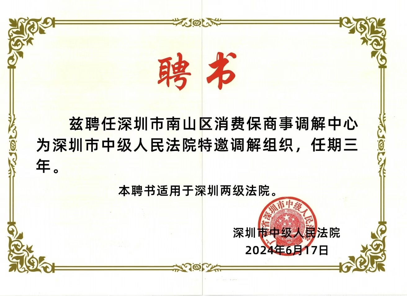 消费保商事调解中心正式成为深圳市中级人民法院特邀调解组织